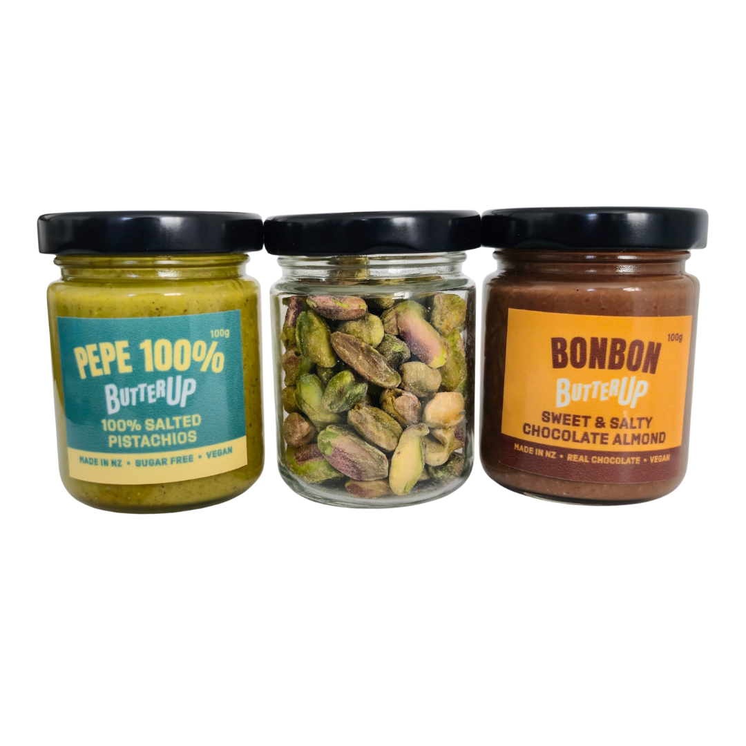 Inside you will find 100g jars of our bestselling LIMITED EDITION PEPE 100% and decadent BONBON, along with a jar of roasted pistachios.